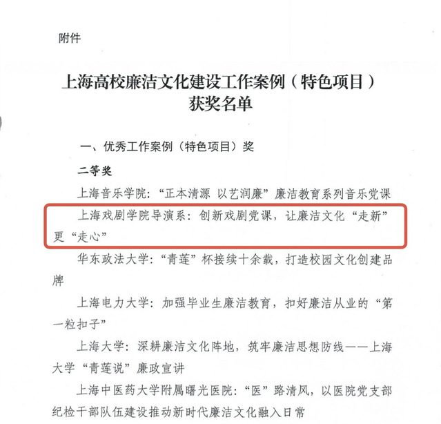 近日,上海高校廉洁文化建设工作案例(特色项目)获奖名单正式公布,上海戏剧学院导演系选送的《创新戏剧党课,让廉洁文化“走新”更“走心”》获得二等奖。这反映了上海戏剧学院党委、纪委指导各院系依托专业优势,全力打造融思想性、教育性、时代性、艺术性为一体的“一院(系、校)一品”廉洁文化建设项目所取得的成绩,也为纵深推进全面从严治党营造了良好氛围。