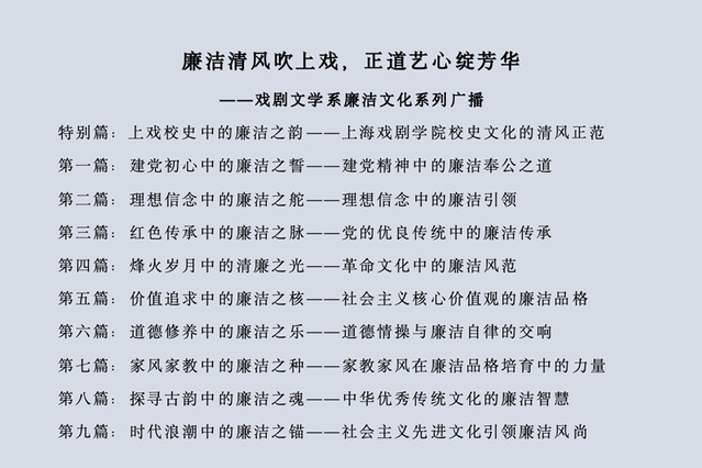以文倡廉,围绕中华优秀传统文化、党史等充分挖掘廉洁文脉,梳理先辈师生的勤廉事迹,协同团学部门开展“廉洁清风吹上戏,正道艺心绽芳华”校园广播。