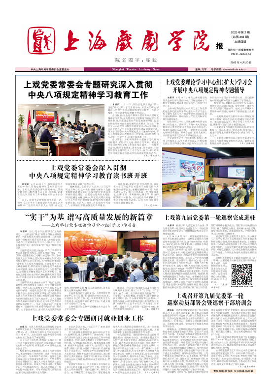 《上海戏剧学院报》2025年第2期(总第355期)已于2025年4月20日出版。重点内容有:《上戏党委常委会专题研究深入贯彻中央八项规定精神学习教育工作》《上戏党委常委会深入贯彻中央八项规定精神学习教育读书班开班》《上戏党委理论学习中心组(扩大)学习会开展中央八项规定精神专题辅导》《“实干”为基 谱写高质量发展的新篇章——上戏举行党委理论学习中心组(扩大)学习会》《上戏第九届党委第一轮巡察完成进驻》等。敬请关注,也可点击下载阅读。(文、编辑:榕树)