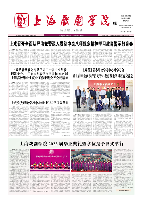 《上海戏剧学院报》2025年第4期(总第357期)已于2025年6月30日出版。重点内容有:《上戏召开全面从严治党暨深入贯彻中央八项规定精神学习教育警示教育会》《上戏党委常委会专题学习二十届中央纪委四次全会、十二届市纪委四次全会和2025届上海高校毕业生就业工作推进会等会议精神》《上戏党委理论学习中心组(扩大)学习会举行》《上戏召开党委理论学习中心组学习会暨上海市全面从严治党警示教育基地学习教育交流会》《上海戏剧学院2025届毕业典礼暨学位授予仪式举行》等。敬请关注,也可点击下载阅读。(文、编辑:榕树)