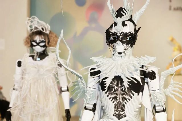 开幕式上亮点不断。“着色·尚戏”创意造型秀,由16名模特呈现多个系列服饰作品,“数智·光影”导览环节,观众则能亲身体验到装置互动艺术。走秀尾声,由上海理工大学、上海卓益得机器人有限公司提供的两名机器人闪亮登场。机器人由舞美系师生们进行造型装扮,他们身着本次展出的服装,与真人模特共同为嘉宾观众们带来了一场别致的演出。