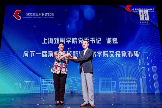 本届交流活动承办院校上海戏剧学院向第十三届中国高等戏剧教育联盟交流活动暨第七届大学生戏剧展演活动承办院校新疆艺术学院郑重地交接了承办杯。