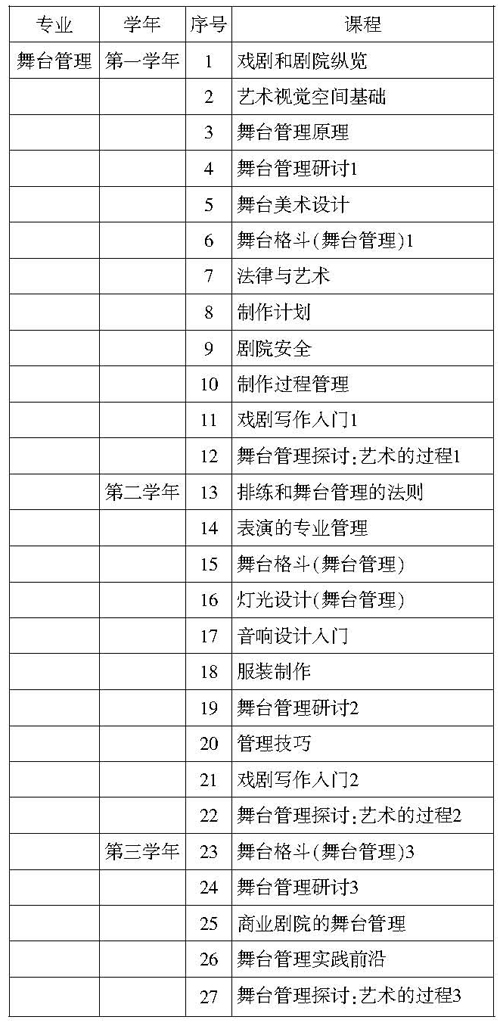 如果说这只是一个宽泛的要求,那么,各个专业在具体实施课堂教学中都有详尽的课程体系设置。耶鲁戏剧学院的MFA的专业包括:表演、设计、音响设计、导演、戏剧创作和评论、编剧、舞台管理、策划与运营、剧院管理等九个专业。以舞台管理为例,将专业课程设置和学年安排列表如下: