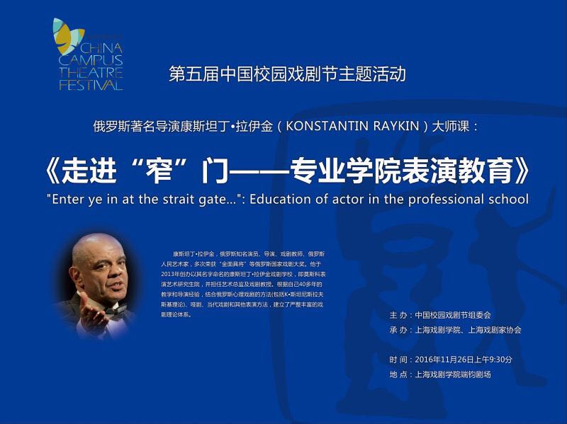 由第五届中国校园戏剧节组委会主办,上海戏剧学院与上海戏剧家协会承办,本周六(26日)上午9:30在上海戏剧学院端钧剧场举办俄罗斯著名导演、教育家拉伊金教授的讲座,着重于俄罗斯表导演教学方法,其中有诸多值得我们思考和学习的内容,请各位老师及相关同学能够莅临、交流。