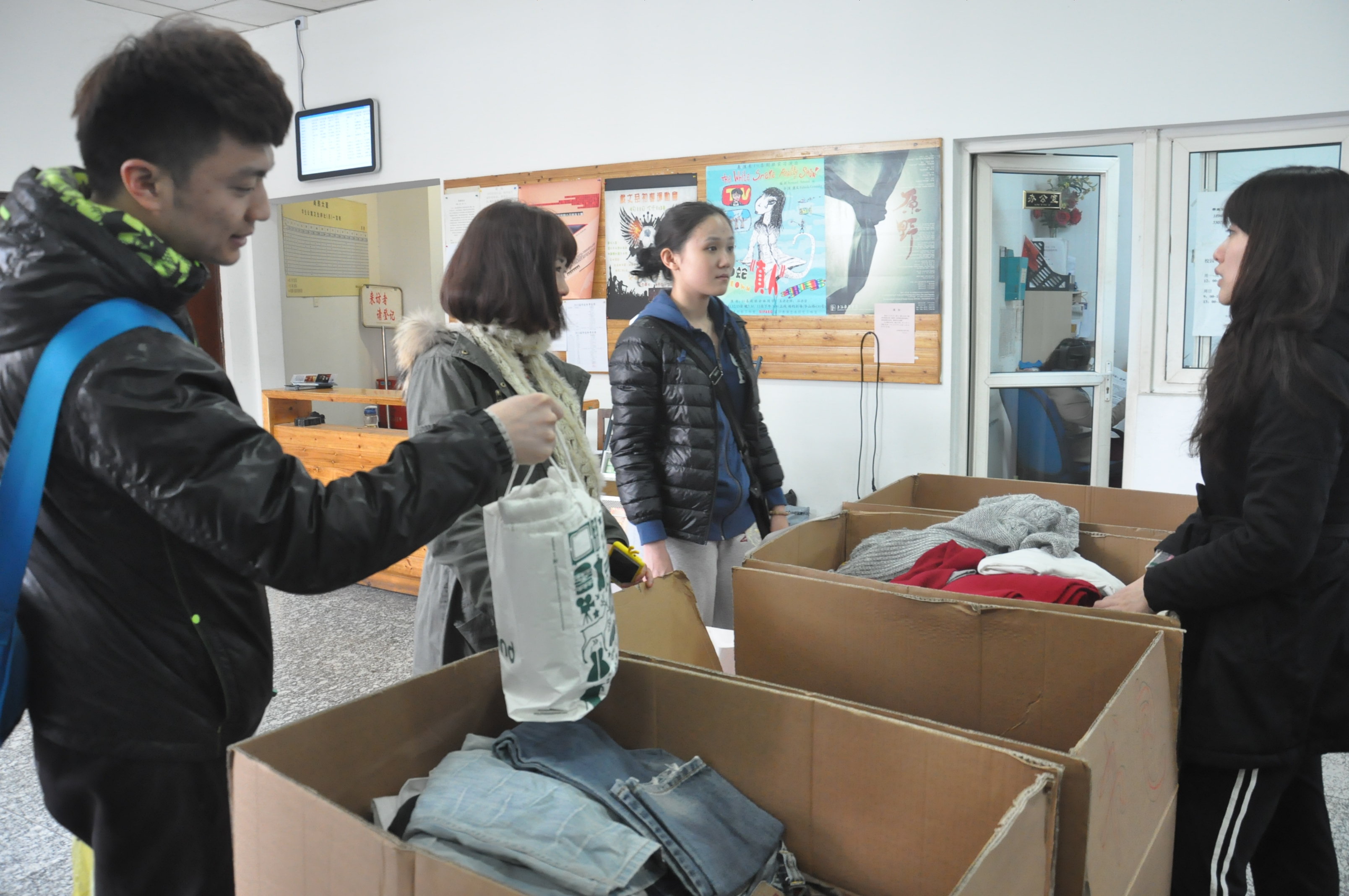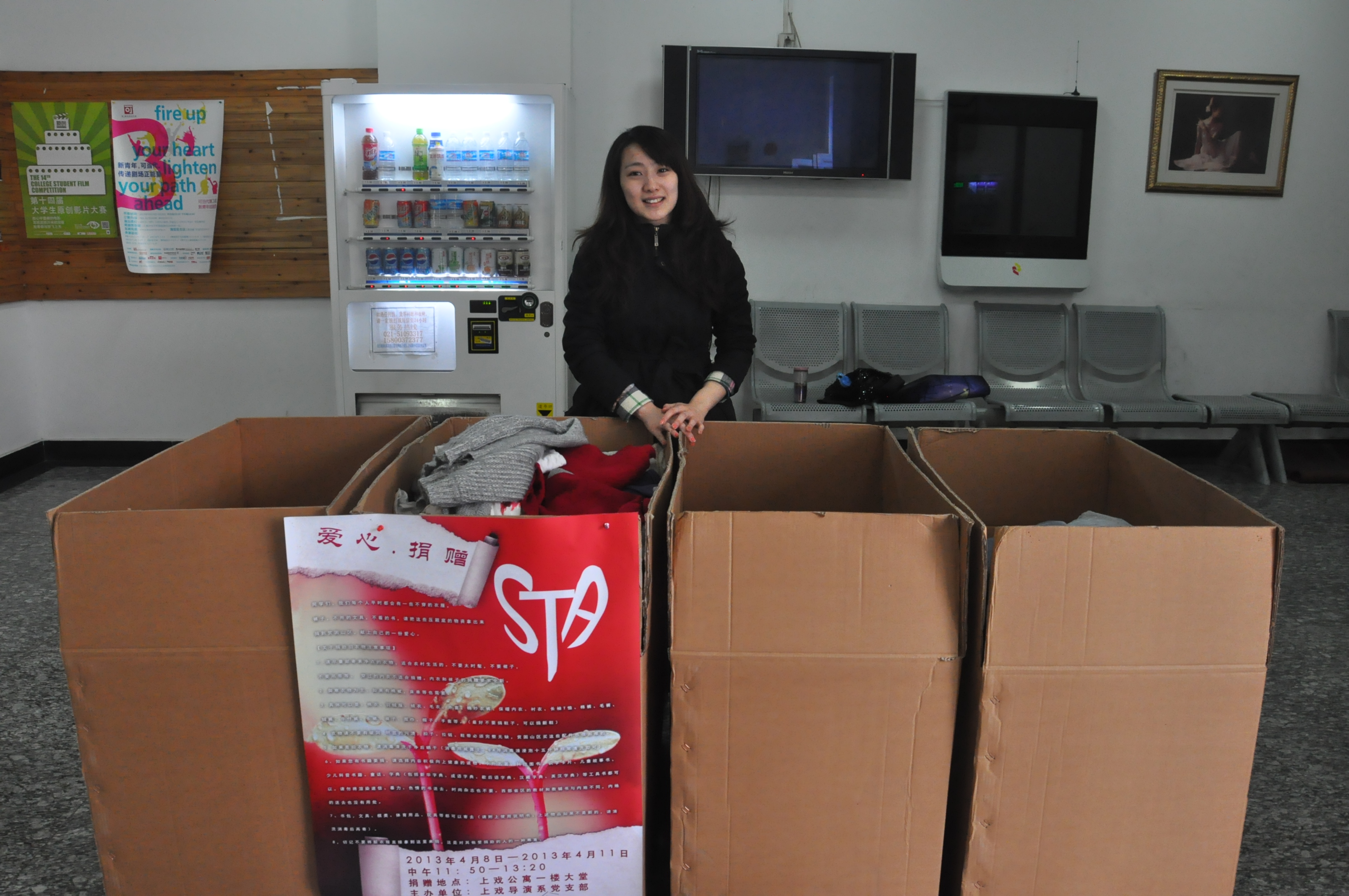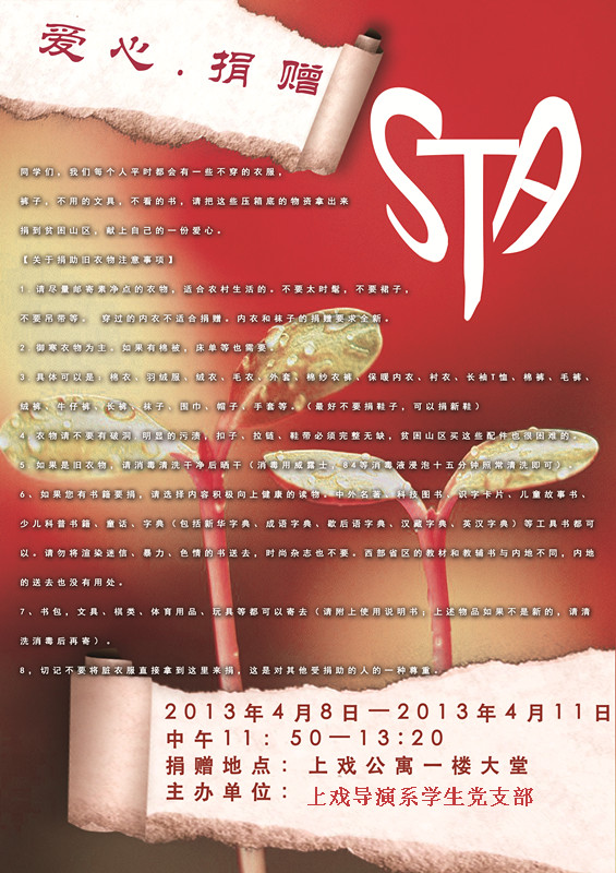 2013年4月8-11日,由上海戏剧学院导演系学生党支部主办的“爱心捐赠”活动在学生公寓一楼大堂举行。该活动主要呼吁同学们将自己平时不穿的衣服、裤子、不用的文具、不看的书以及一些压箱底的物资拿出来捐到贫困山区、献上一份自己的爱心。活动受到上戏师生的广泛关注,捐赠者络绎不绝,大家纷纷捐出自己闲置的物品,为贫困山区的孩子献上一份关心。许多同学希望学校能多举办一些类似的献爱心活动,将爱心传递,让世界充满爱。(文/图 10导演 代如意)