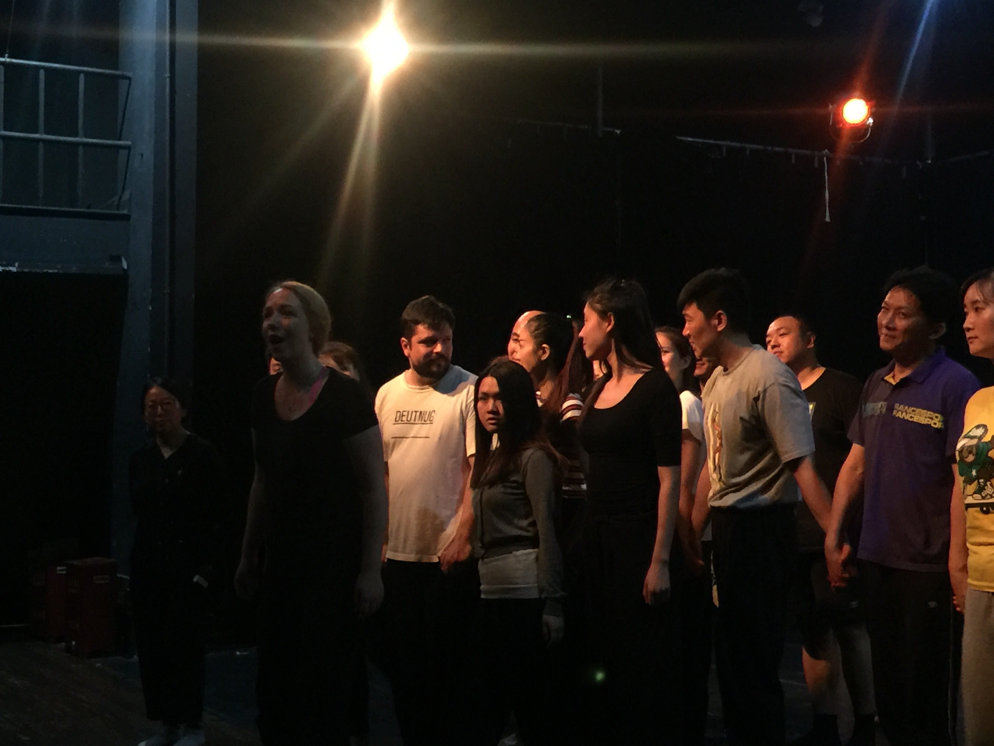 第五天,老师将第一天学员们所分享的三个词和故事与歌曲的演唱进行了结合,在带领学员进行热身练习的间隔中,老师随机选择学员,在其耳边低语为其制造规定情境,之后让学员开始唱歌。学员们在舞台上歌唱的好与坏不再是重点,每一刻产生的情绪都成为能量聚集在一起。