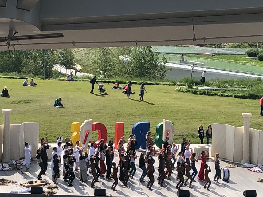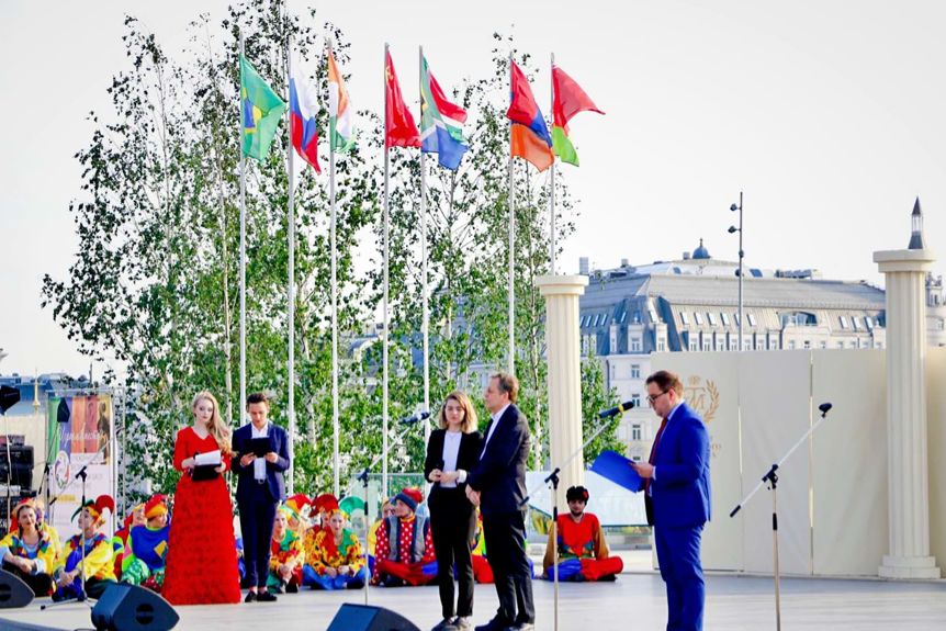5月28日,戏剧节在克里姆林宫旁的科扎里亚季耶公园露天剧场举行。国际剧协总干事托比亚斯发表讲话,对金砖国家戏剧节的举办予以了充分肯定。在各代表团出场环节,当介绍到中方代表团时,场上响起《春节序曲》,上戏团队和着音乐节拍跳起了极具中华民族特色的舞蹈,将现场气氛带向了高潮。