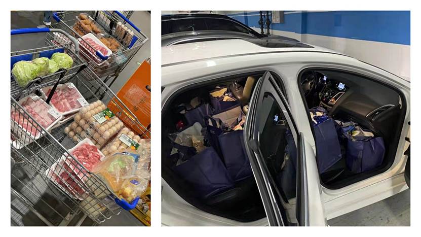近日的“倒春寒”让上海骤然回到了寒冬,今天的气温仍然不到10℃。一大早,佳健老师就驱车前往家附近的超市进行采购,不一会儿就把两辆购物车装得满满当当,肉蛋、蔬菜、面包、调味料,应有尽有。分好袋子、打包完,佳健老师便开着他的“小白”挨家挨户地进行“配送”。因为封闭管理,老师们只能在小区门口短暂地进行交接。导演系有位老师因为封楼无法下楼,佳健老师便贴心地留了张纸条,移交给小区的工作人员代为转交。