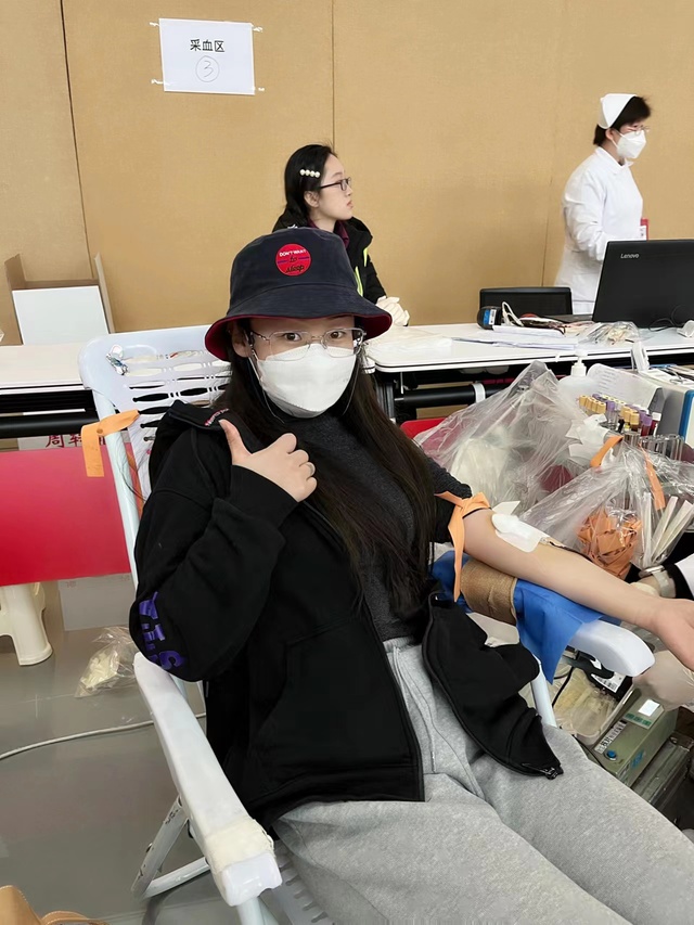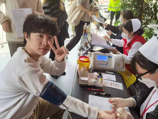 献血现场,我们导演系学子有序排队,在志愿者的引导下逐一完成信息登记、健康征询、量血压、血液检验、采血等流程。