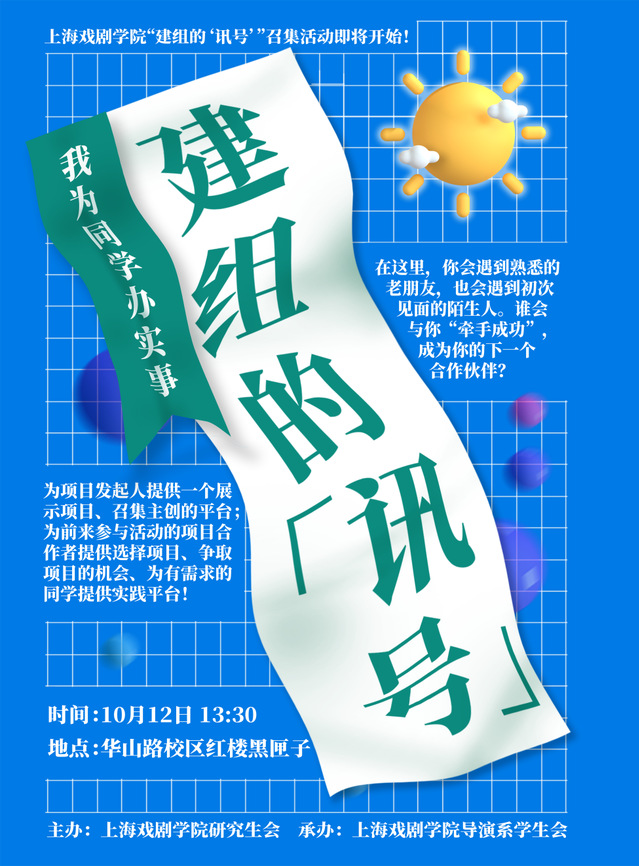 经过交流和讨论,党员同志一致认为研究生作品的剧组招募存在一定的困难,希望能够开展一个针对性的活动,搭建一个平台,让跨院系的同学有更多交流和碰撞的机会,也让项目负责人可以介绍一下剧目的信息,让同学们了解,也可以带动建组可以更加迅速和高效。为了践行“以学正风以学促干”的要求,推进“我为同学做实事”系列活动做深做实。导演系学生党支部在党总支的引领下,立足学校特色,推出了“建组的‘讯号’”校园活动,以“跨院系、面对面、高效率”为活动目标,为项目发起人提供一个展示项目、召集主创的平台;为前来参与活动的项目合作者提供选择项目、争取项目的机会;为有积累经验需求的同学提供实践平台。