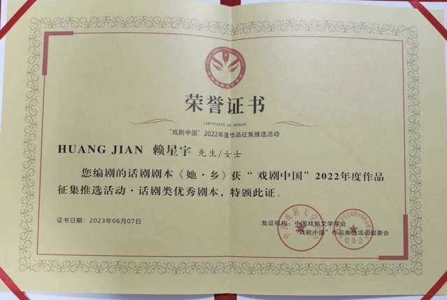 在中国戏剧文学学会2022年度“戏剧中国”话剧类剧本评选中,由上海戏剧学院导演系博士留学生黄剑作为第一作者、上海戏剧学院戏文系硕士研究生赖星宇作为第二作者创作的原创剧本《她·乡》,在全国范围内的话剧类“优秀作品”中排名第五。