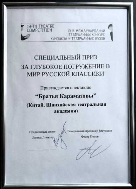 2023年11月15日至19日,在俄罗斯莫斯科,上海戏剧学院导演系2022级戏剧导演研究生班级携导演系原创作品《卡拉马佐夫兄弟》受邀参加第43届俄罗斯国立电影学院国际大学生艺术节暨第十九届国际戏剧比赛,该剧在刚结束“一带一路”国家传统表演艺术展演中获得一致好评,11月17日,《卡拉马佐夫兄弟》在戏剧节作为闭幕演出作品,最终经过多位国际评委的评审获得“深入了解俄罗斯经典作品世界奖”,充分得到当地戏剧艺术家以及来自世界各地艺术家和学者的肯定和褒扬!
