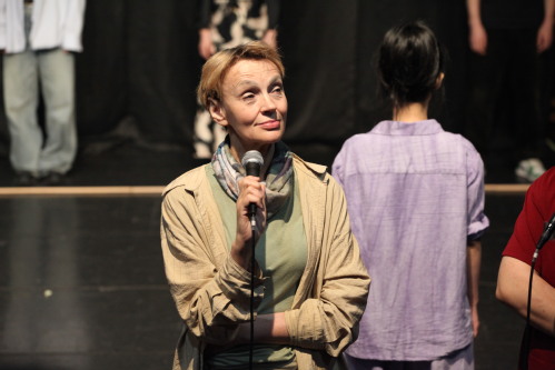 第二天,学员们选择了《海鸥》中的角色和独白,这一次的要求是打开自己,在人群中找到对手,随后确定对手,见面、拥抱、拍背、分开,寻找下一位对手,通过与对手互动,学习如何在舞台上建立联系和交流,她指导学员们不要过于紧张,将空间占满,将能量传播给整个空间,同时保持交流性,互动性。最后她给所有同学一个新名词——“上舞台”,手拿木棍,开始慢速旋转,叶莲娜·库金娜强调了空间的利用和能量的传播,以及舞台表演中的互动性。