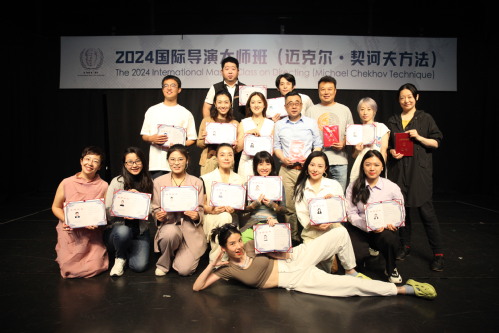 总结会结束后,卢昂教授为部分学员们颁发了结业证书,并合影留念。至此2024国际导演大师班(迈克尔·契诃夫方法)为期四周的学习正式完美收官。
