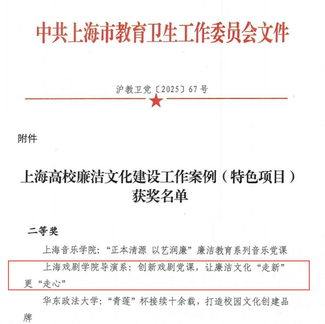 为深入学习贯彻习近平新时代中国特色社会主义思想,持续推进全面从严治党,上海戏剧学院导演系积极参加上海高校廉洁文化建设工作案例(特色项目)征集活动。学校纪检监察部门充分发挥协助引导推动作用,悉心指导,在素材选用、经验总结、文本打磨等方面给予专业且细致的建议。经市教卫工作党委评审遴选,导演系申报的《创新戏剧党课,让廉洁文化“走新”更“走心”》获上海高校廉洁文化建设工作案例(特色项目)二等奖。
