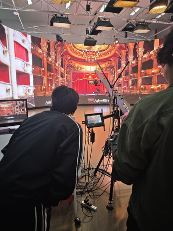 随后,同学们近距离参观和体验了“上海市虚拟环境下的文艺创作重点实验室”内的Kinect体感交互、激光投影等项目,还了解了虚拟制片的创作流程以及LED环屏的工作原理,通过先进的虚拟拍摄技术,创作者可以在更自由的创作空间中探索艺术表现的边界,突破传统拍摄的限制。