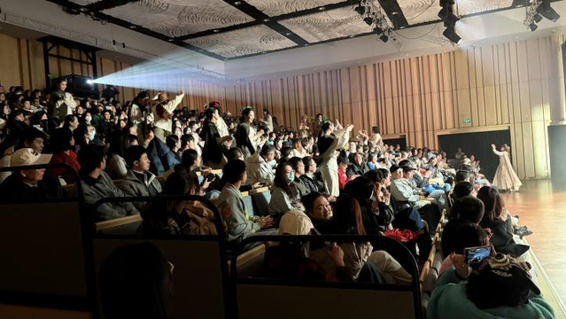 当晚演出结束后,剧组和北大师生举行了演后谈活动。活动由上海戏剧学院导演系理论教研室主任章文颖副教授主持。导演系主任卢昂教授、石俊副教授、何好副教授,北京大学周映辰教授与学生主创共同参与对谈。导演系师生向观众介绍了排演莎士比亚戏剧的语言处理技巧、导演构思的创造过程以及创作演出的收获。北大的观众对上戏学子的专业和敬业精神深深打动,也被导演系学生挥洒青春的艺术浪漫情怀和才情所折服。这场演后谈不仅是学术探讨,更是为青年创作者与学界开辟了直接对话的平台。