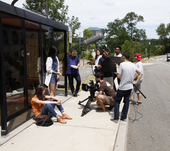 7月,由姚扣根教授带队,我校师生一行八人赴美国新泽西蒙特克莱尔州立大学进行为期两周的微电影教学合作。早在出行之前,经中美双方沟通后,确定以中学生校园生活为题材的剧本创作构想,赴美的研究生团队提出了大量构思,最终甄选出五个构思,研究生们撰写中英文剧本大纲,由美方编剧教授苏珊针对每个构思完成“剧本医生”的工作。由此拉开了本次赴美第一周的编剧工作坊。通过苏珊教授的“诊断”,同学们将剧本大纲细化成中英文两个完整剧本。经过五天高强度的剧本工作坊,苏珊教授带领大家将剧本的每一个对话立体地再现成每一帧画面,研究生们表示对写作过程中将“镜头画面”还原成剧本镜头语言的过程有了新的领悟,同时,撰写英文剧本也使研究生们感受到了美国编剧行业的写作规范,也提高了个人的英语水平。