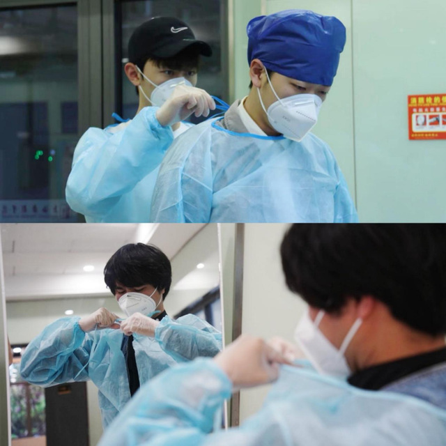 在送餐的队伍中,同学们欣喜地发现,学院党总支书记韩永胜老师和副书记王春云老师也默默地穿上防护设备,和志愿者同学们一起将热腾腾的餐食送到每间宿舍的门口,更将学院对同学们的关怀和问候传递给每位足不出室的同学。