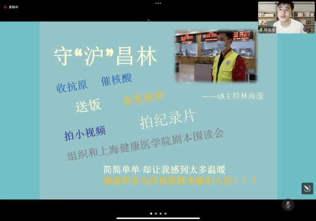 五四青年节之际,志愿者吴晨曦、耿婕、黄诗雨,也受邀参加了由上海戏剧学院昌林校区疫情防控专班主办的“‘五四之光·激荡百年’——上戏志愿青年交流分享会”,分享了她们的志愿者故事。
