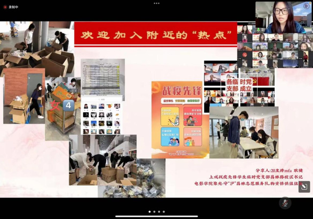 5月2日,电影学院开展了聚光·守“沪”昌林志愿服务队之先锋志愿者分享会,活动邀请了在本次抗“疫”工作的志愿服务工作中表现突出的第一批先锋志愿者代表进行了志愿工作的分享和交流。他们是党员、是班委、是学生会骨干,他们从物资保供服务、应急机动服务、新闻宣传等环节入手,讲述了一个个志愿抗“疫”中平凡而又感人的故事。