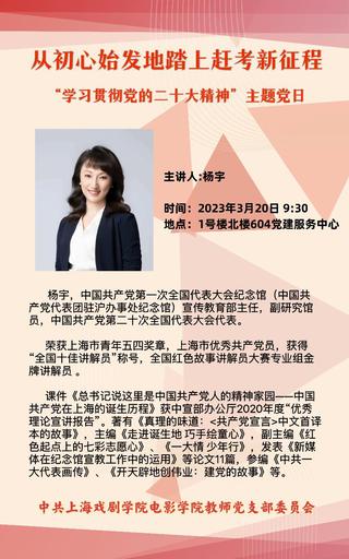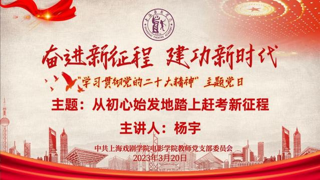 为进一步深入学习贯彻二十大精神,加强党史教育与专业建设相结合,2023年3月20日,上海戏剧学院电影学院教师党支部举行“学习贯彻党的二十大精神”主题党日活动,邀请中国共产党第二十次全国代表大会代表、中共一大纪念馆宣传教育部主任杨宇同志,为支部党员和部分学生党员、积极分子做主题为《从初心始发地踏上赶考新征程》的专题讲座。