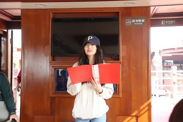 从纪念馆一路向北,支部党员们前往南湖会景园码头,来到当年一大参会代表登船的故地,在波光粼粼的湖边登上了游船前往湖心岛瞻仰当初的红船。在游船上,学生党员洪慧程和石翊之分别为大家带来了红船上的一堂特别的微党课。