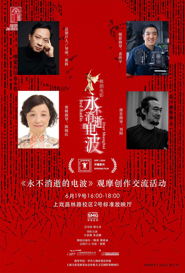 2024年6月19日下午,舞剧电影《永不消逝的电波》观摩放映及主创见面交流会在上海戏剧学院昌林路校区5号楼B座2号标准放映厅如期举行。本次活动是上海戏剧学院电影学院参与本届上海国际电影节的多个活动之一。上戏电影学院院长厉震林、党总支书记韩永胜、党支部副书记王春云及电影学院各系各专业的教师代表们出席本次活动。电影学院全体党员师生也都观看了这部红色经典电影。