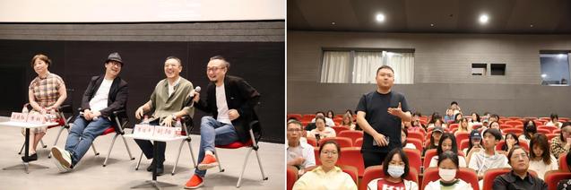 放映结束后,电影《电波》的总制片人、导演崔轶,摄影指导袁佳平,剪辑指导陈晓红,以及演员指导刘阳等几位主创老师与同学们进行了深入的交流,详细分享了影片的创作缘起和制作过程中的心得体验。