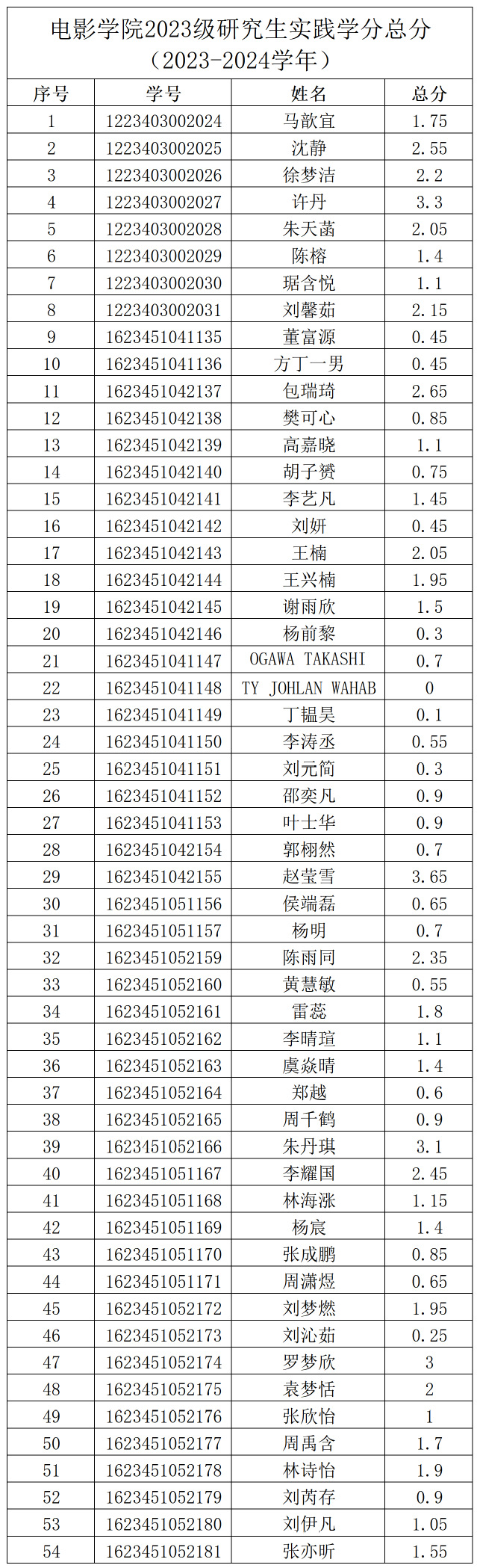 2023-2024学年电影学院研究生实践学分经各部门汇总,经学生自查、申诉,经电影学院研究生实践学分评审小组对申诉材料进行复核、评定,现将实践学分总分予以公示。