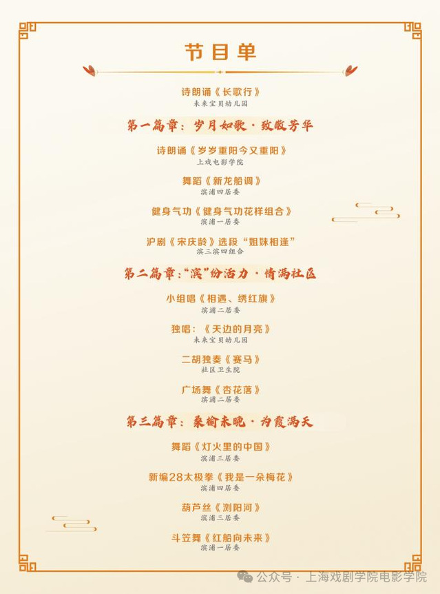 1011日,上海戏剧学院电影学院学生第二党支部与聚光青年志愿者服务队的同学们积极参与了由浦锦街道举办的重阳节慰老活动。本次活动的主题围绕“情系桑榆慰晚情,街区连心暖金秋”展开,旨在通过精彩纷呈的文艺汇演,为社区的银龄群体送上节日的欢乐与温暖。这也是电影学子第二年受邀参加社区重阳节慰劳活动。
