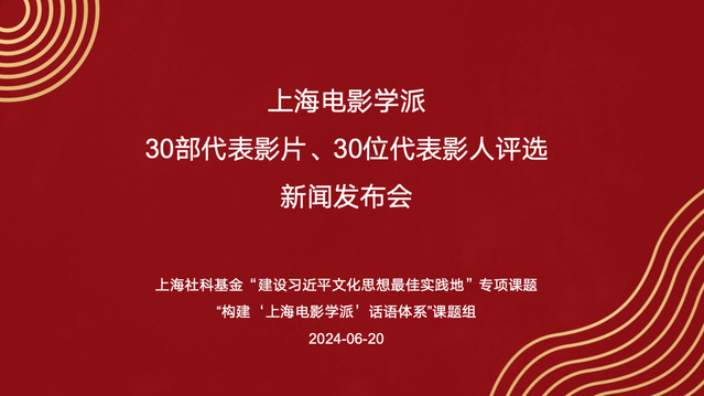 2024年6月20日上午,由上海社科基金“建设习近平文化思想最佳实践地”专项课题“构建‘上海电影学派’话语体系”课题组、上海戏剧学院电影学院联合主办的“上海电影学派30部代表影片、30位代表影人评选”新闻发布会在上海戏剧学院昌林路校区举行。上海市文艺评论家协会副主席、上海戏剧学院电影学院院长、课题组负责人厉震林,上海戏剧学院电影学院电影制作系主任黄望莉,上海戏剧学院电影文化研究中心副主任万传法,人民网、解放日报等多家媒体记者出席。本次新闻发布会揭晓了“上海电影学派30部代表影片、30位代表影人”评选结果。