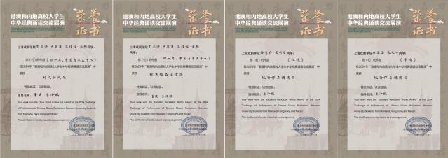 2024年港澳和内地高校大学生中华经典诵读交流展演活动中,《那一年,中国青年正十八》(贺子洪、苏佳怡、高畅、卢冠廷)斩获时代新风奖和优秀作品诵读奖;作品《红铁》(宋明哲、丛意丹)、《等待》(石芷菡、张之一)荣获优秀作品诵读奖。这些作品不仅展现了学子们对中华经典的深刻理解和传承,也体现了他们对时代精神的把握和表达。