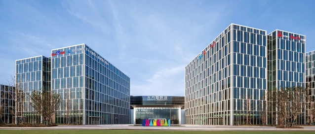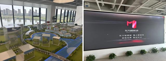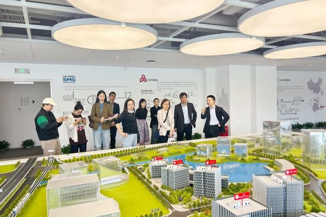 在上海东方明珠房地产有限公司副总经理谢艺伟的陪同下,学院团队首先通过项目沙盘全方位了解这座浦江之畔的文化地标。东方智媒城由上海广播电视台旗下东方明珠(600637.SH)所属文化地产和上海临港集团旗下上海临港(600848.SH)所属临港浦江共同投资开发并运营。总建筑面积约100万平方米,以“智慧、活力、共享”为核心理念,目前已形成影视创制、数字文化、科技金融等产业集聚态势,成为长三角文化科技融合的新增长极,不仅展现出园区强大的产业实力,更为学生实践实习与创新创业提供了广阔空间。