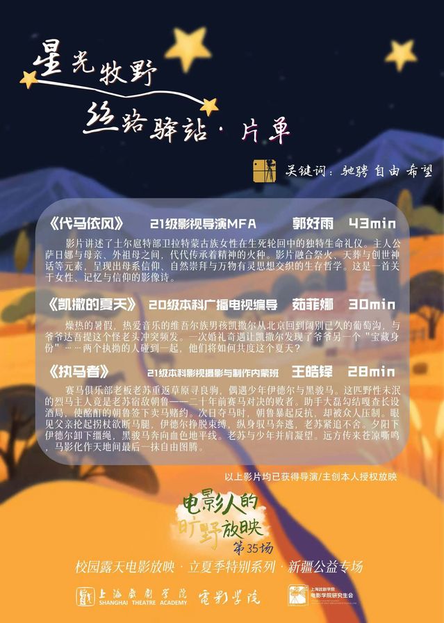 星河低垂,场灯渐明,观众的目光仍驻留于丝路两端的青春交响中。这场立夏之约,让上戏学子在公益践行中淬炼创作担当,为新疆少年推开光影世界的窗棂。当银幕成为跨越山河的星桥,电影便不止是故事,更是点燃心野、共绘未来的火种。让我们怀抱星光,行路牧野再逢。