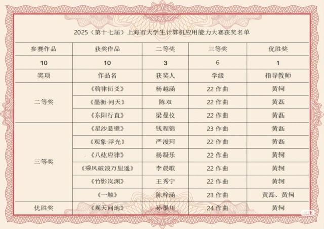 在2025年第十届“汇创青春”以及第十七届上海市大学生计算机设计大赛获奖名单中,电影学院电影作曲系学生共获得22项奖项的好成绩,其中汇创青春一等奖5项、二等奖4项、三等奖3项,计算机应用能力大赛二等奖3项、三等奖6项、优胜奖1项。大赛获奖作品受到了相关专业领域和社会的广泛关注与好评。同时,在本次大赛中,我院作曲系黄轲老师指导学生成绩优秀,获得了优秀指导教师奖,可喜可贺!