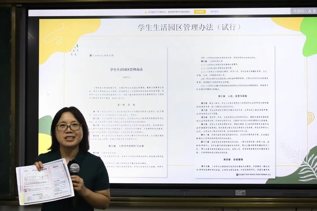 学生生活园区负责人郭冠彦老师围绕园区管理新规,解读了学生在寝室安全、卫生、公共秩序等方面的责任与权益。她结合《校园逃生示意图》指出,园区为学生提供紧急逃生通道,园区管理新方法进一步细化了寝室违规行为的认定与处理流程,同时根据《学生控烟规定》,鼓励同学们以规范为基、以文明为要,维护校园洁净环境,做到无烟校园,减少火灾隐患,共同维护园区秩序。同时,郭老师建议大家保存值班电话,积极反应情况和沟通,共建和谐校园。