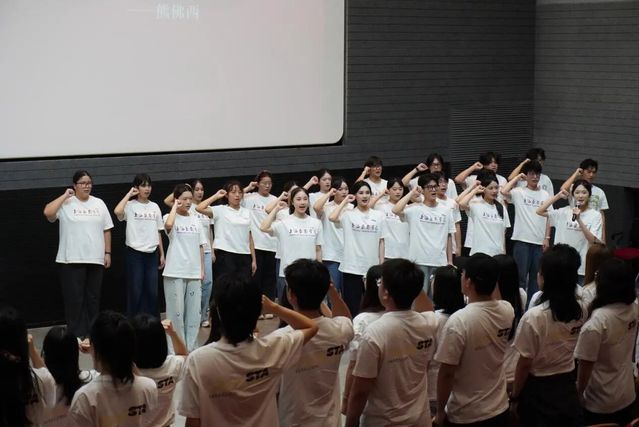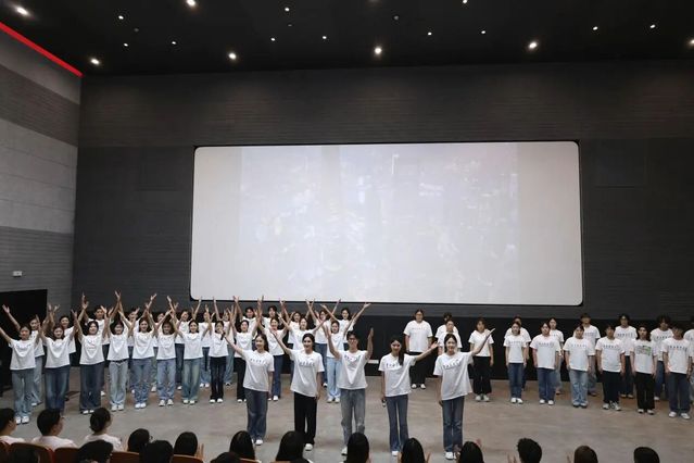 戴上校徽的新生们全体起立,庄严宣誓。随后,25级主持班同学的诗朗诵《当我戴上校徽时》喊出了全体新生的心声,而作曲班同学带来的合唱《世界赠予我的》则用悠扬歌声传递出青春力量,共同宣告着他们已准备好与“上戏”二字血脉相连。