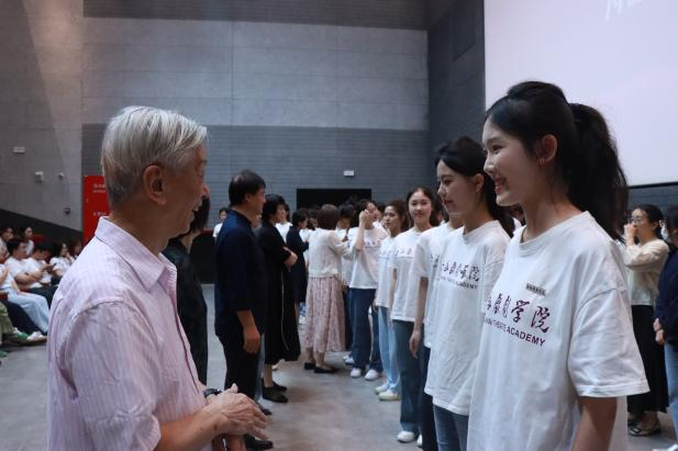 “我自己也同样非常幸运,我和母校同龄。” 电影学院前身“电视艺术系”的创办者、80岁的张仲年先生精神矍铄地站上讲台,将一段尘封的历史娓娓道来。从虹口横浜桥边的初心,到华山路的正式启航,再到如今昌林路校区的崭新图景,张老师个人的成长史与上戏80年的发展史交织辉映,让历史变得鲜活可感。他寄语新生:“要求真、扬善、尚美……努力成长为AI时代科艺融合的复合型人才”。