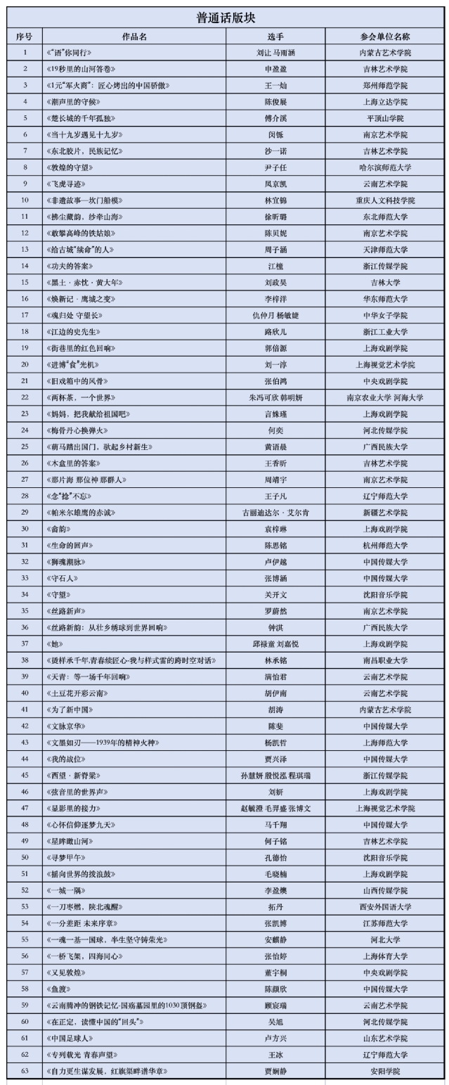 普通话版块入围名单(按照作品首字母顺序排列):