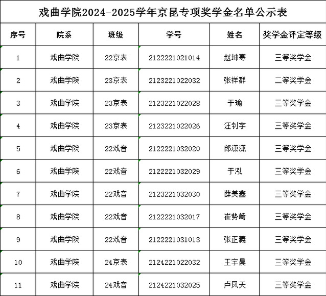 为进一步调动京昆表演、戏曲音乐专业学生在专业学习中的主动性和积极性,及时表彰该专业学生在专业领域的优异成绩,依据《京昆艺术传承保护专项奖学金评选办法》规定,我校在近期开展了2024-2025学年京昆专项奖学金的评审工作。现将评审结果公示如下。