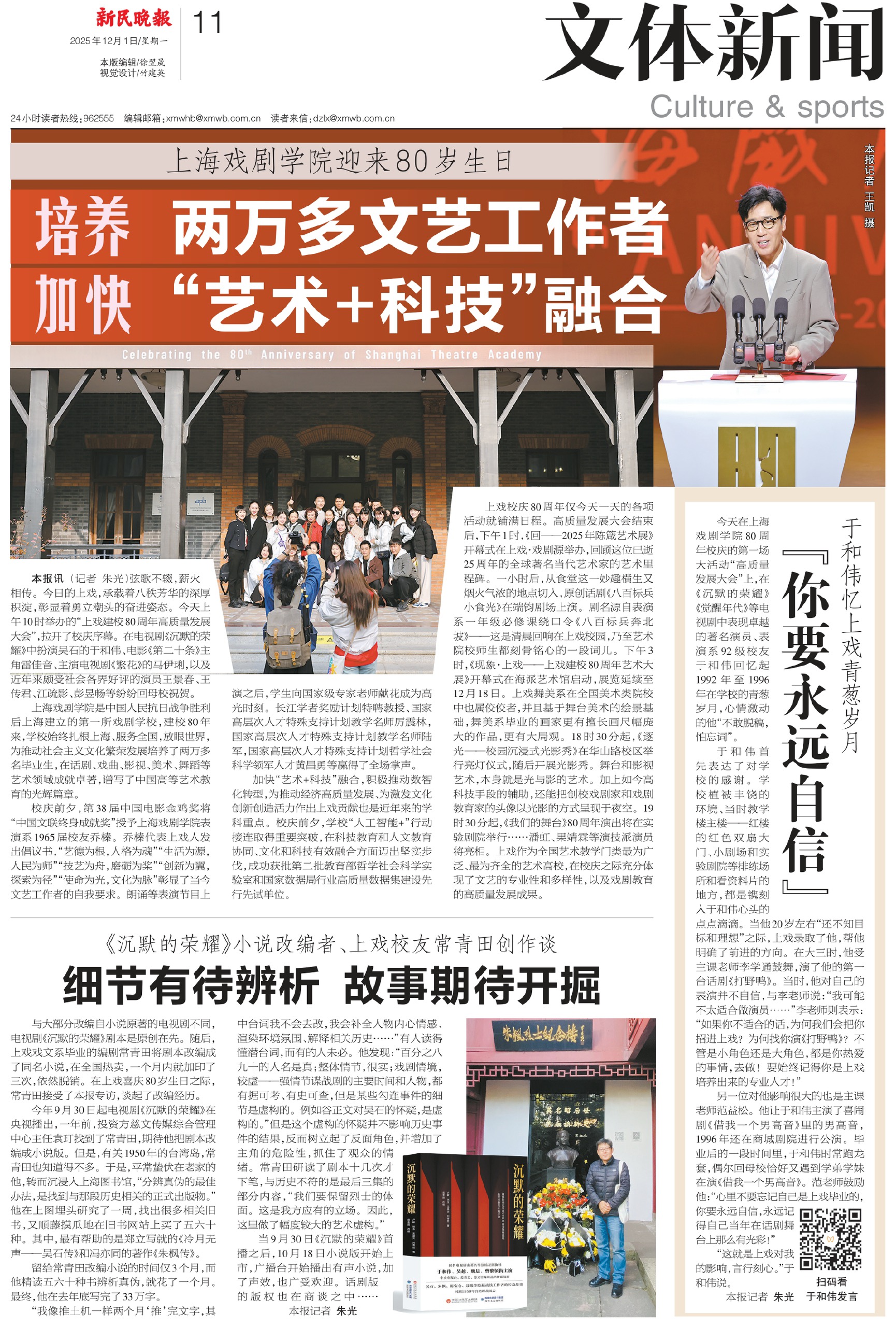 本报讯(记者 朱光)弦歌不辍,薪火相传。今日的上戏,承载着八秩芳华的深厚积淀,彰显着勇立潮头的奋进姿态。今天上午10时举办的“上戏建校80周年高质量发展大会”,拉开了校庆序幕。在电视剧《沉默的荣耀》中扮演吴石的于和伟、电影《第二十条》主角雷佳音、主演电视剧《繁花》的马伊琍,以及近年来颇受社会各界好评的演员王景春、王传君、江疏影、彭昱畅等纷纷回母校祝贺。