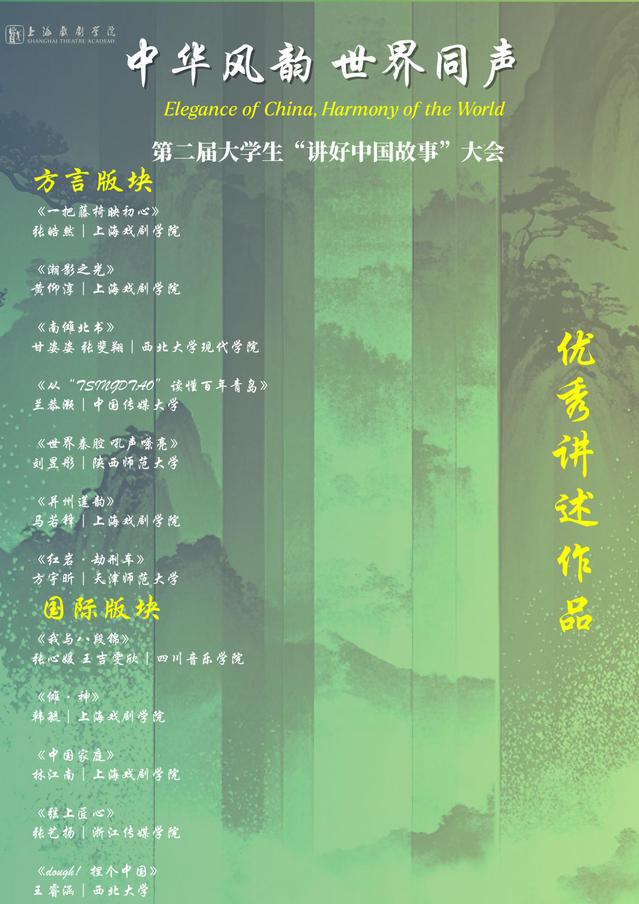12月5日,第二届大学生“讲好中国故事”大会全国决选暨荣誉授予典礼在上海戏剧学院昌林路校区新剧场圆满举行。本次活动由上海戏剧学院、中国电视艺术家协会青少年教育专业委员会指导,上海戏剧学院电影学院主办,上海社会科学院俄罗斯中亚研究中心、上海大学海派文化研究中心协办,上海戏剧学院电影学院播音与主持艺术系承办,上海戏剧学院党委宣传部提供了特别支持。