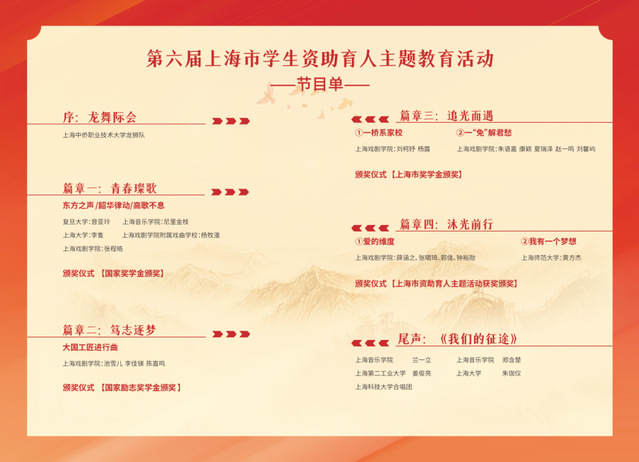 围绕“爱心启航 筑梦青春”主题,本次活动分为“青春璨歌”“笃志逐梦”“追光而遇”“沐光前行”四个篇章。上戏表演系(含音乐剧中心)学生充分发挥专业特长,以情景朗诵《爱的维度》《一桥系家校》《大国工匠进行曲》以及情景剧《一“免”解君愁》等一系列原创节目,生动演绎了资助政策背后的暖心故事。同学们用沉浸式的表演、真挚的情感表达,将政策条文转化为感人至深的舞台场景,实现了“艺术与育人”的深度融合。