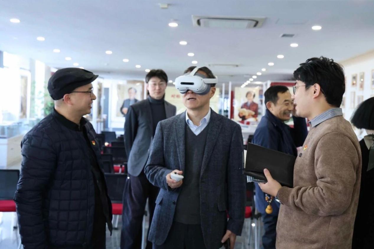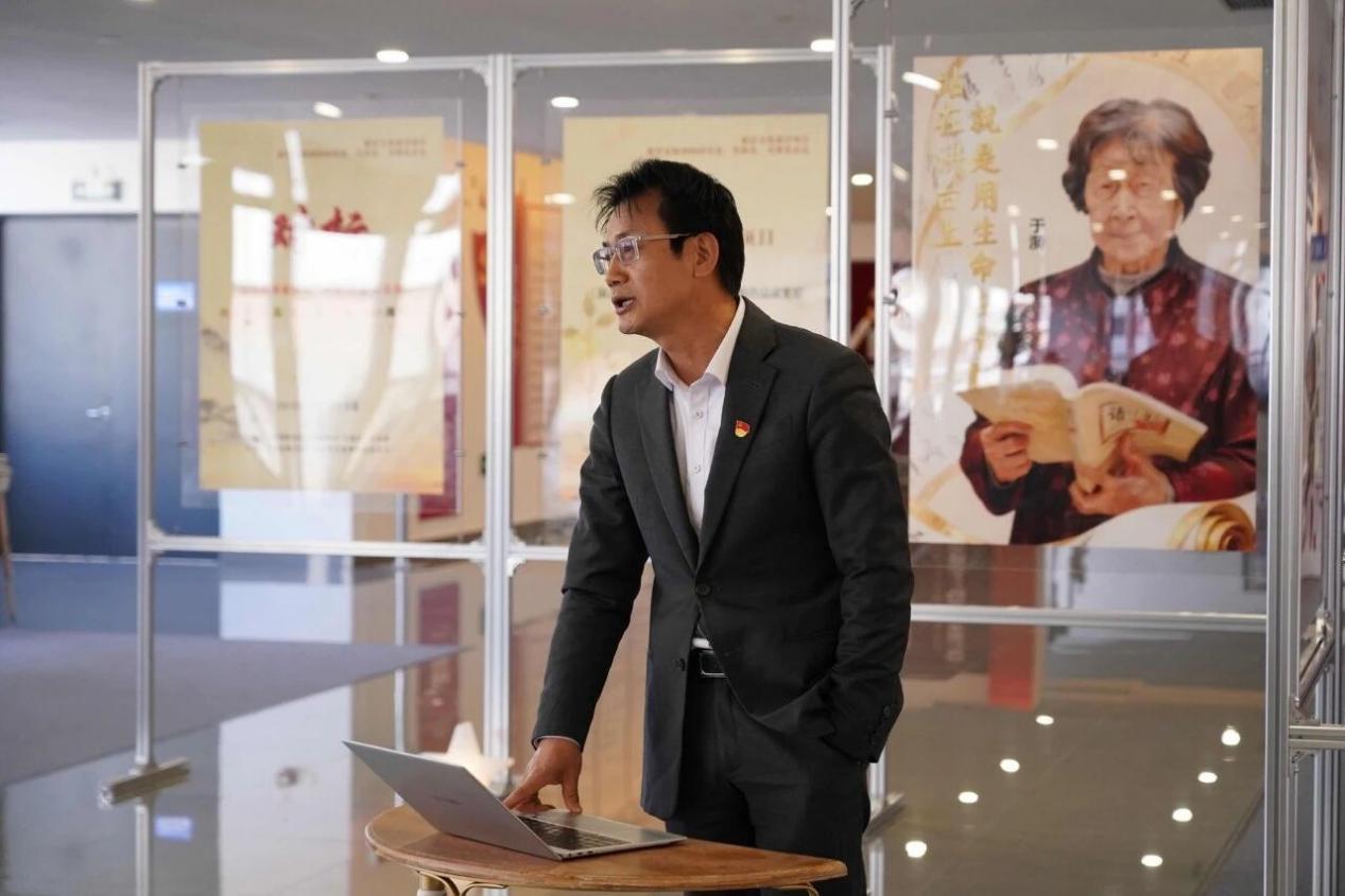 活动最后,全体人员在党总支副书记薛嘉的引导下步入展区交流观展。展览围绕教育楷模事迹,打造了手绘、影像、AI文创、VR体验四大板块。