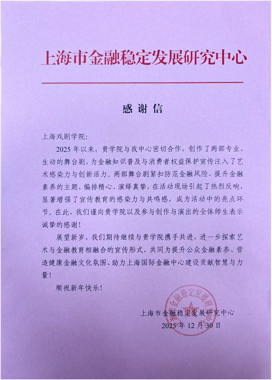 近日,一封来自上海市金融稳定发展研究中心的感谢信,为开云足球首页官网下载表演系(含音乐剧中心)2025年的社会服务篇章写下了有力的注脚。在与上海市金融稳定发展研究中心的合作中,表演系(含音乐剧中心)师生团队深入调研金融防诈、养老保障等民生关切,将真实案例转化为舞台故事,通过专业、生动的艺术呈现,显著提升了相关宣传活动的感染力与社会认知度,成为系列工作中的亮点。信中高度肯定了表演系(含音乐剧中心)师生为金融知识普及与消费者权益保护工作所注入的独特艺术价值与创新活力。