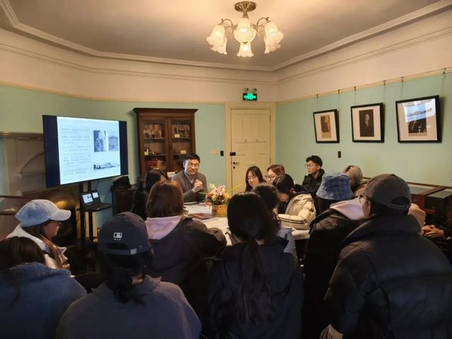 梧桐掩映的老洋房静立在城市的街角,推门而入,时光仿佛悄然放缓。25级戏剧教育专业的学生跟随讲解员穿梭于展厅,细看泛黄的信笺、手稿,先生的美育理念在静默的展陈中渐渐清晰。行至三楼,大家围坐在一起,从所见所感聊到对美育的理解,言谈间不时碰撞出新的思索。这一程,不只走进了一段历史,更在细腻的感知中,触碰到了美育的温度与戏剧的力量。
