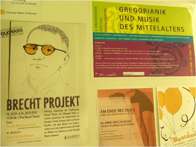 After the Chinese rehearsal of the Sino-German Brecht Acting Program in Shanghai Theater Academy in 2012 autumn, on March 13rd, eight teachers and students from two directing majors of STA came to Folkwang Universität der Künste in Ruhr Region in Germany, the hometown of Brecht. Folkwang Universität der Künste is an integrated art university famous in Germany and the whole Europe. Modern dance, musical composing, musical and more majors are at leading edge globally in art education field. We cooperate with the body acting major, which is renowned for its serious teaching and experimental acting. The major only receive 5 undergraduates and one or two postgraduates. In this acting program in Brecht, we both appoint two postgraduates to be directors, and 5 students to be actors. They are rehearsing two plays: The Good Person of Sichuan by Brecht and The Fairy and good woman by Professor Sun Huizhu from STA.