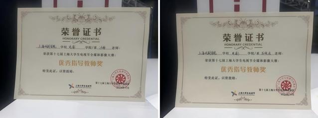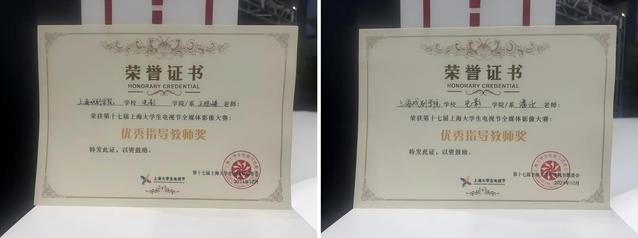 In the 17th Shanghai University Student TV Festival All-Media Image Competition, teachers Xiao Xiangning, Pan Ru, Wei Dongxiao, Wan Chuanfa, Wang Xufeng, Jiang Haiyang, Sha Yang and Liao Miaojing from the College of Film were awarded the title of Excellent Guiding Teacher. Also, in the "17th Shanghai University Student TV Festival Host Competition," teachers Dong Jian, Zhang Dapeng and Li Zepeng from the College of Film were awarded the title of Excellent Guiding Teacher.