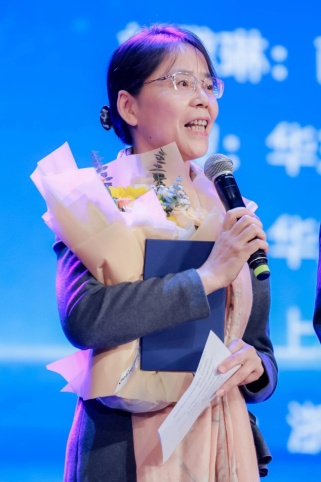 Professor Pan Ru from the Shanghai Theatre Academy delivered a speech on stage as the guiding teacher for one of the award-winning works.